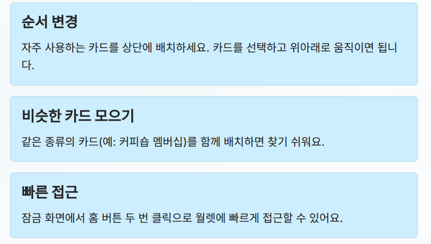 아이폰 월렛을 더 효율적으로 사용하는 방법을 몇 가지 알려드릴게요. 우선, 자주 사용하는 멤버십 카드는 상단에 배치하는 것이 좋아요. 그리고 비슷한 종류의 카드는 연속해서 배치하면 찾기 쉬워요. 예를 들어, 커피숍 멤버십 카드들은 함께 모아두는 식으로요.