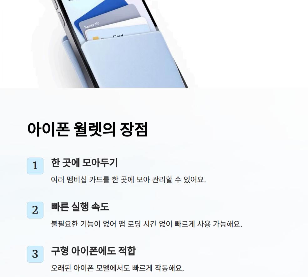 아이폰 월렛의 가장 큰 장점은 여러 카드를 한 곳에 모아둘 수 있다는 점이에요. 게다가 불필요한 기능이 없어서 속도도 빠르답니다. 특히 최신 아이폰이 아닌 구형 모델을 사용하시는 분들은 포인트 적립을 위해 앱이 로딩되는 시간을 기다려야 하는 불편함이 있었는데, 아이폰 월렛을 이용하면 이런 문제도 해결할 수 있어요!