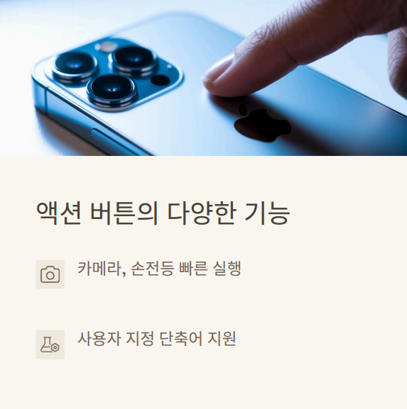 아이폰 15 프로에서 가장 눈에 띄는 변화 중 하나는 기존의 음소거 스위치 대신 추가된 액션 버튼이에요. 이 버튼은 단순히 소리를 켜고 끄는 것 이상의 기능을 제공해요. 설정에서 액션 버튼을 검색하고 들어가면 다양한 기능을 할당할 수 있어요. 카메라를 빠르게 실행하거나, 손전등을 켜거나, 음성 메모를 녹음하는 등 여러분이 자주 사용하는 기능을 설정할 수 있죠.