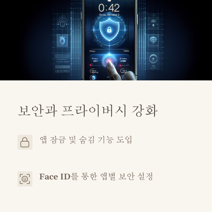 iOS 18에서는 프라이버시가 향상되어 아이폰이 잠금 해제된 상태에서도 Face ID나 Touch ID를 요구하여 앱을 잠글 수 있습니다. 또한 앱을 숨겨 홈 스크린에서 제거하고 인증 없이는 접근할 수 없는 앱 라이브러리의 숨겨진 폴더에 보관할 수 있습니다. 잠겨 있거나 숨겨진 앱은 알림을 보내지 않으며 검색에서도 사용할 수 없습니다.