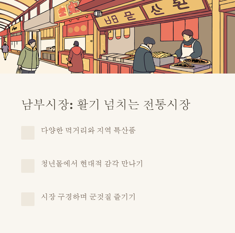 남부시장은 전통 시장의 정취와 함께 젊은이들의 아이디어가 만나는 곳이에요. 특히 청년몰은 꼭 들러보세요!