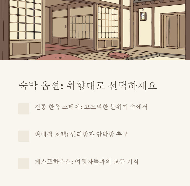 | 한옥 스테이 | 전주 한옥마을 내 게스트하우스 | 전통적인 분위기, 한옥 체험 |