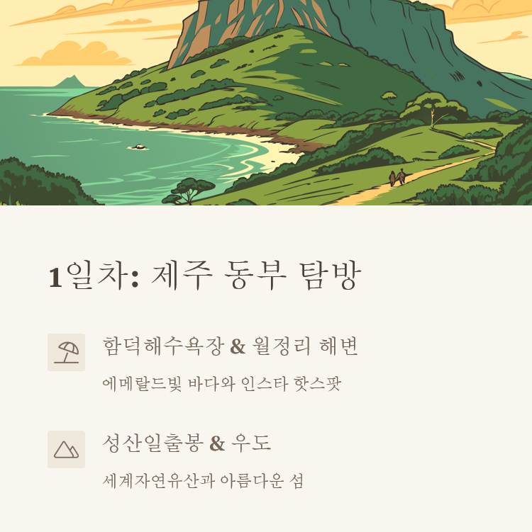 1일차: 제주 동부 지역 탐방 제주도 여행의 첫날은 동부 지역을 중심으로 계획해 보았어요. 동부 지역은 성산일출봉과 우도 같은 제주도의 대표적인 명소들이 모여 있는 곳이에요. 아침 일찍 공항에 도착했다면, 바로 렌터카를 빌려 동부로 향해보세요. 먼저 함덕해수욕장에서 시작하는 것을 추천해요. 함덕해수욕장은 제주 공항에서 차로 약 40분 거리에 있는데, 에메랄드 빛 바다와 하얀 백사장이 펼쳐져 제주도 해수욕장 중에서 가장 아름답고 이국적인 곳으로 알려져 있어요. 해변 뒤로 카페, 맛집 등 편의시설이 잘 되어 있고 주차장도 넓어서 이용하기 편리합니다. 그 다음으로는 월정리 해변으로 이동해보세요. 월정리 해변은 인스타그램에서 인기 있는 포토스팟으로, 에메랄드 빛 바다와 검은 현무암이 조화를 이루는 아름다운 풍경을 자랑합니다.