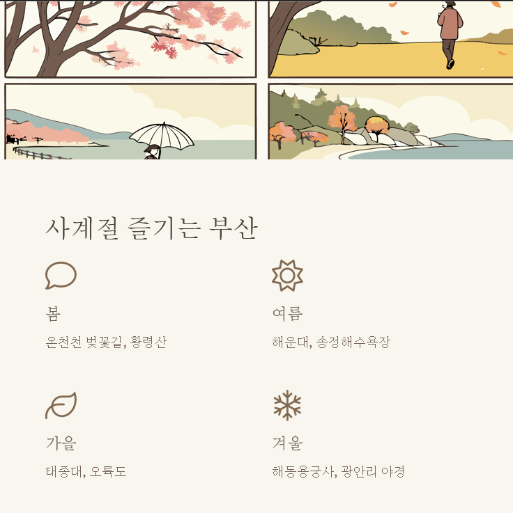 | 봄: 해동용궁사, 벚꽃 명소 여름: 해운대, 광안리 가을: 태종대, 오륙도 겨울: 감천문화마을, 용두산공원 |