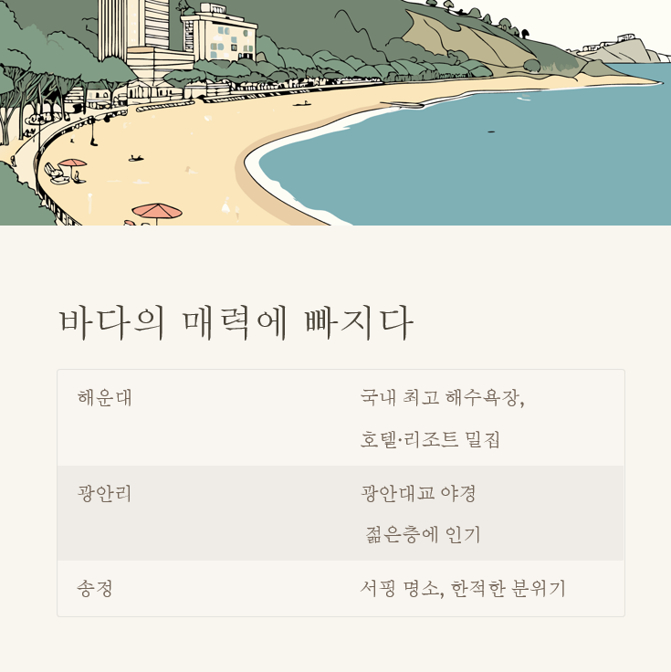 | 해변 산책 | 일몰 시간 | 광안대교 뷰 포인트 |
