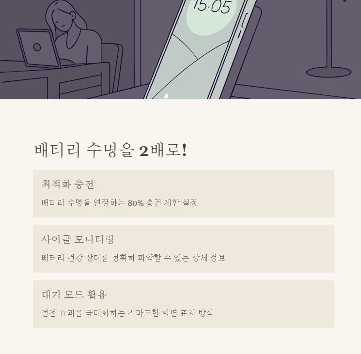 | 80% 충전 제한 | 배터리 수명 연장 | 야간 충전 시 활용 |