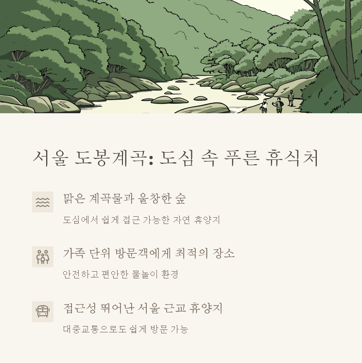 | 도봉계곡 | 서울 1호선으로 접근 가능한 도심 속 계곡 |