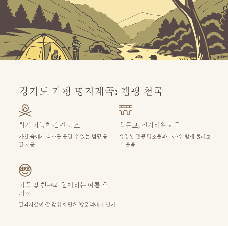 7. 가평 거림내 캠핑하우스 - 숨은 보석 같은 계곡 알려지지 않은 서울 근교 숨은 취사 가능 계곡, 가평 거림내캠핑하우스는 한적한 분위기에서 자연을 만끽하고 싶은 이들에게 추천합니. 캠핑과 계곡 물놀이를 동시에 즐길 수 있어 여름 휴가지로 제격입니다.