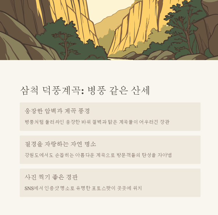 4. 삼척 덕풍계곡 - 병풍 같은 산세의 절경 가곡면 소재의 덕풍계곡은 1용소, 2용소, 3용소로 불리고 있습니다. 병풍처럼 둘러싸인 산세가 수려하며 자연경관이 뛰어난 여러 개의 폭포가 산재해 있어 피서지로 안성맞춤입니다.