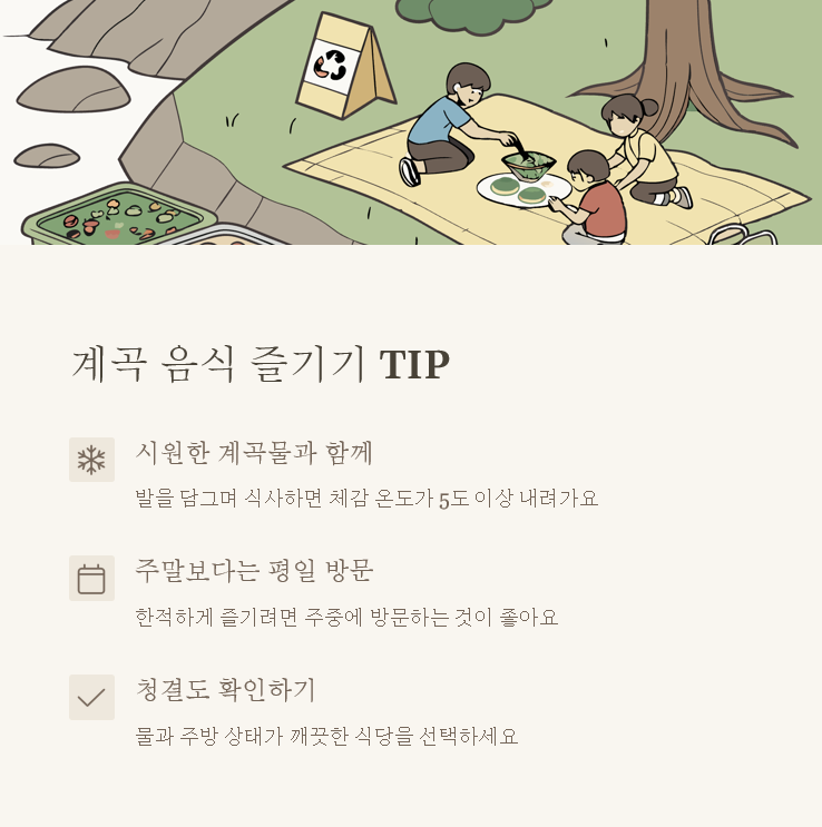 | 시원한 계곡물과 맛있는 식사 | 백숙, 막걸리, 파전 |