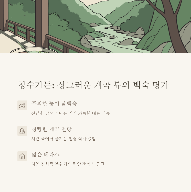 첫 번째로 소개할 계곡 맛집은 청수가든이에요. 이곳은 싱그러운 계곡 뷰를 감상하며 몸보신을 할 수 있어 여름철 인기가 정말 많아요. 특히 비주얼부터 푸짐한 오리백숙과 닭백숙이 대표 메뉴인데, 시원한 계곡 전망을 바라보며 백숙과 막걸리를 즐기는 분들이 많이 찾는답니다. 백숙 외에도 닭도리탕과 오리로스, 그리고 술안주로도 좋은 해물파전과 도토리묵 등의 메뉴도 판매하고 있어서 여럿이 가서 다양하게 먹기에도 좋을 것 같아요. 특히 밑반찬부터 맛있다는 평이 이어지는 것도 이 집의 매력 포인트죠!