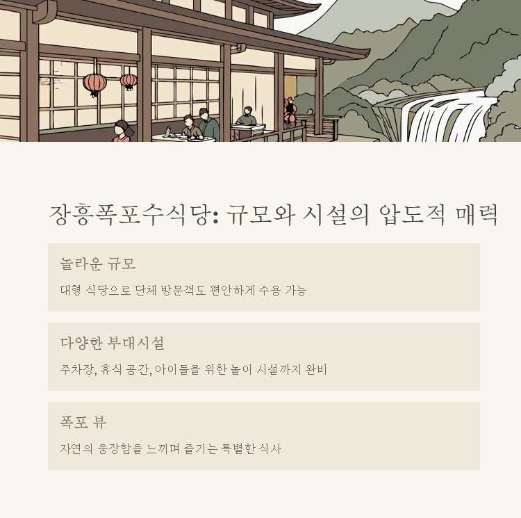 두 번째 계곡 맛집은 양주에 위치한 장흥폭포수식당이에요. 장흥계곡 유원지 안에 있는 이 식당은 규모가 정말 놀라워요. 축구장, 족구장, 단체펜션, 캠핑 등 다양한 시설과 시원한 계곡까지 함께 즐길 수 있어 인기가 많답니다. 메뉴로는 능이 닭백숙이 가장 인기 있는데, 깊은 국물과 부드러운 닭고기가 정말 일품이에요. 시원한 산바람을 맞으며 뜨끈한 국물을 먹으면 세상을 다 가진 기분이 든다고 해요. 닭백숙을 비롯해 오리백숙, 삼겹살까지 다양한 메뉴를 계곡 옆에서 먹을 수 있어요. 더위에 지친 몸에 활력을 불어넣어 줄 최고의 장소랍니다!