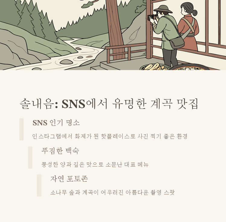 네 번째로 소개할 계곡 맛집은 경기도 양주 장흥계곡 근처에 있는 솔내음이에요. 이곳은 방송인이자 웹툰 작가 '기안84'가 다녀가 더 유명해졌다고 해요. 맛있는 백숙과 SNS 맛집으로 소문이 자자한 곳이랍니다. 솔내음의 가장 큰 매력은 식당에서도 평상에 앉아 시원한 물에 발을 담글 수 있다는 점이에요. 돌 위에 앉아 차가운 물에 몸을 식히면서 뜨끈뜨끈한 음식을 먹을 수 있다는 것만으로도 여름 감성이 충만해지죠. 백숙의 재료가 정말 푸짐해서 냄비 밖으로 닭고기가 삐져나올 정도라고 하니 얼마나 넉넉하게 내주시는지 짐작이 되죠? 친구들과 함께 가서 막걸리 한 병과 함께 즐기면 여름 더위가 싹 가실 거예요!