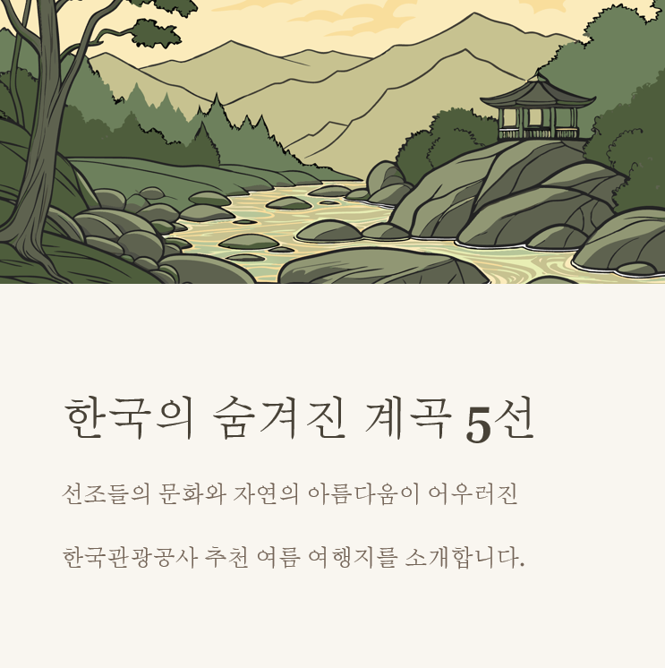 안녕하세요, 여러분! 무더운 여름이 다가오면서 시원한 여행지를 찾고 계신가요? 오늘은 제가 한국관광공사 추천 계곡 여행지를 소개해드릴게요. 우리 선조들도 더위를 피해 계곡에서 풍류를 즐겼다고 하는데, 그 전통을 이어 저도 여러분과 함께 멋진 계곡 여행을 떠나보려고 해요. 청량한 물소리와 푸른 자연이 어우러진 풍경, 벌써부터 설레지 않나요?