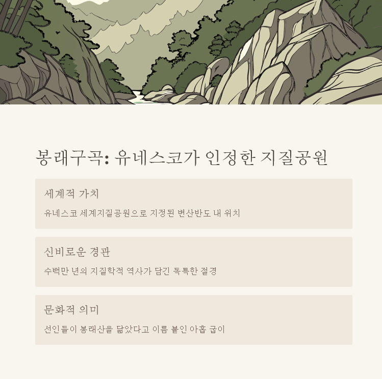 마지막으로 소개할 곳은 전북 부안의 봉래구곡이에요. 전북서해안 국가지질공원이 유네스코 세계지질공원으로 지정된 변산반도 내에 있어 더욱 특별한 여행지랍니다. 봉래구곡은 약 20km에 이르는 하천 지형 아홉 곳을 일컫는데, 현재는 1~5곡만 볼 수 있어요. 아쉽게도 6~9곡은 1996년 부안댐이 완공되면서 물에 잠겨 볼 수 없게 되었답니다.
