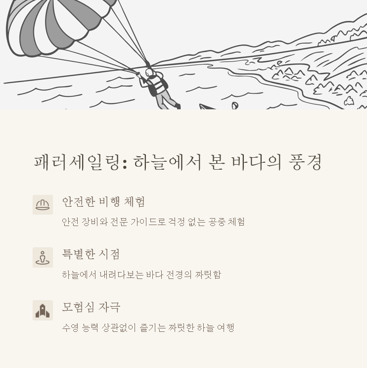 | 패러세일링 | 부산 해운대, 제주도 | 수영복, 선크림, 선글라스 |