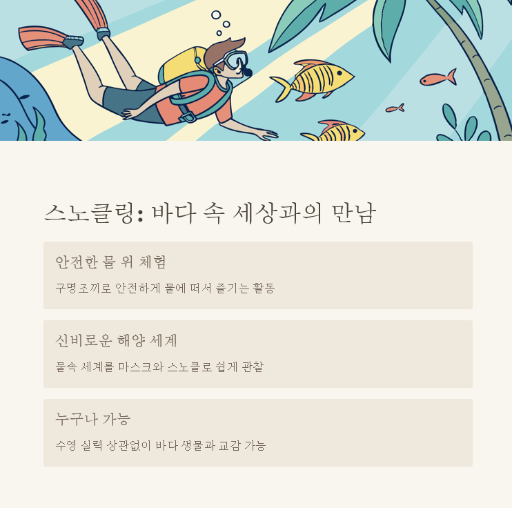 스노클링은 초보자가 가장 쉽게 도전할 수 있는 해양 스포츠 중 하나예요. 물 위에 떠서 아래를 구경하기 때문에 수영을 잘 못해도 충분히 즐길 수 있답니다! 스노클링 장비는 마스크, 스노클(숨 쉬는 관), 핀(오리발) 세 가지만 있으면 돼요. 요즘은 얼굴 전체를 덮는 풀페이스 마스크도 있어서 호흡이 더 편하답니다. 맑은 바다에서 형형색색의 물고기들과 아름다운 산호초를 직접 눈으로 보는 경험은 정말 잊지 못할 추억이 될 거예요. 처음 시도하는 분들은 구명조끼를 착용하거나 현지 가이드와 함께하면 더 안전하게 즐길 수 있어요.