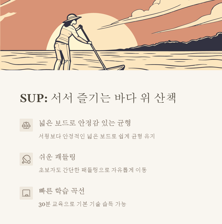 서핑은 어려워 보이지만, SUP(스탠드업 패들보드)는 훨씬 쉽게 시작할 수 있어요! 넓고 안정적인 보드 위에 서서 패들로 물을 저어 나아가는 방식이라 균형 잡기가 비교적 쉽답니다. 처음에는 무릎을 꿇고 시작해서 점차 일어서는 연습을 하면 누구나 금방 즐길 수 있어요. 잔잔한 호수나 바다에서 즐기기 좋고, 운동효과도 뛰어나서 코어 근육과 균형감각을 향상시키는 데 도움이 돼요. 여유롭게 경치를 감상하며 즐기는 것도 좋고, 친구들과 함께 패들보드 위에서 요가를 해보는 것도 색다른 경험이 될 거예요. 아침 일찍 고요한 물 위에서 일출을 보며 패들보드를 타본다면 그것만으로도 특별한 추억이 될 거예요.