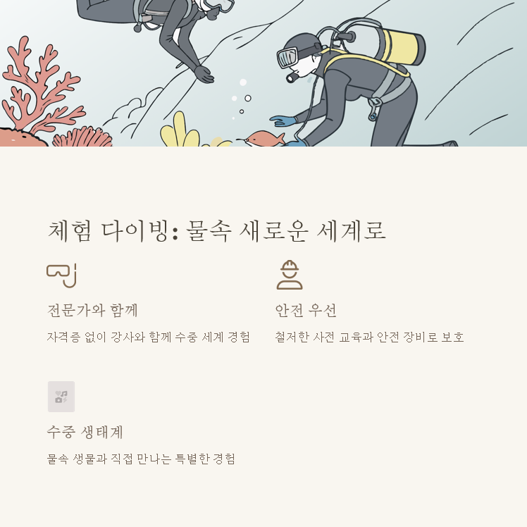 | 체험 다이빙 | 제주도, 고성 | 수영복, 개인 수건 |