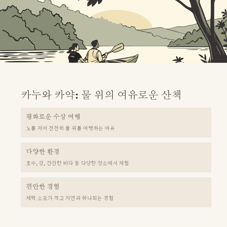 | 1인/2인용 카누, 카약 | 남한강, 북한강, 경포호 | 구명조끼 필수, 기본 패들링 배우기 |