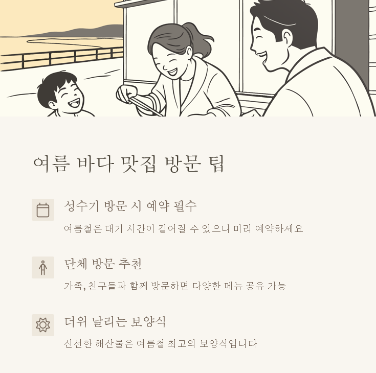 지금까지 여름 바다 맛집 네 곳을 소개해 드렸는데요, 어떤가요? 벌써부터 침이 고이지 않나요? 동해안의 시원한 물회부터 서해안의 풍성한 조개구이까지, 각 지역마다 특색 있는 바다 음식들이 우리를 기다리고 있어요. 이번 여름에는 가족, 친구, 연인과 함께 바다 맛집을 찾아 신선한 해산물의 참맛을 느껴보는 건 어떨까요? 더위도 날려버리고 맛있는 추억도 쌓을 수 있는 일석이조의 기회랍니다! 여러분의 여름 미식 여행이 행복하고 맛있기를 바랄게요!