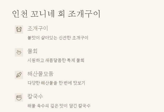 | 해물칼국수 | 9,000원 | 넉넉한 해물, 칼칼한 국물 |