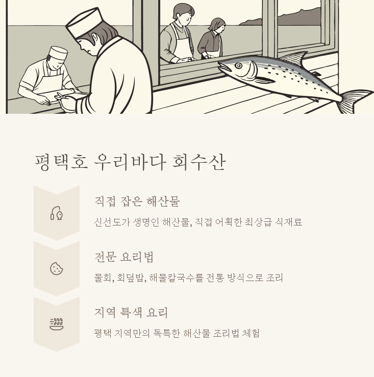 마지막으로 소개할 곳은 평택호의 '우리바다 회수산'이에요. 이곳은 박판규 어촌계장의 아내와 아들 두 모자가 운영하는 맛집으로, 싱싱한 제철 해산물로 유명해요. 특히 박 어촌계장이 서해바다에서 직접 잡은 해산물을 사용한다는 점이 많은 이들이 이곳을 찾는 이유랍니다.