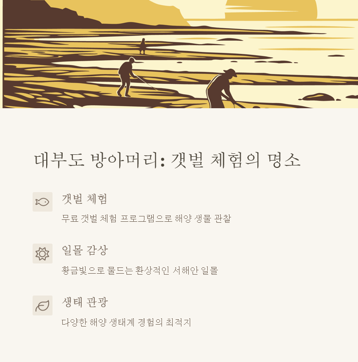 날씨와 조석 시간을 미리 체크하는 것도 중요해요. 특히 갯벌체험을 원한다면 썰물 시간에 맞춰 방문해야 하고, 일몰을 보고 싶다면 해질 시간을 미리 확인해두세요.