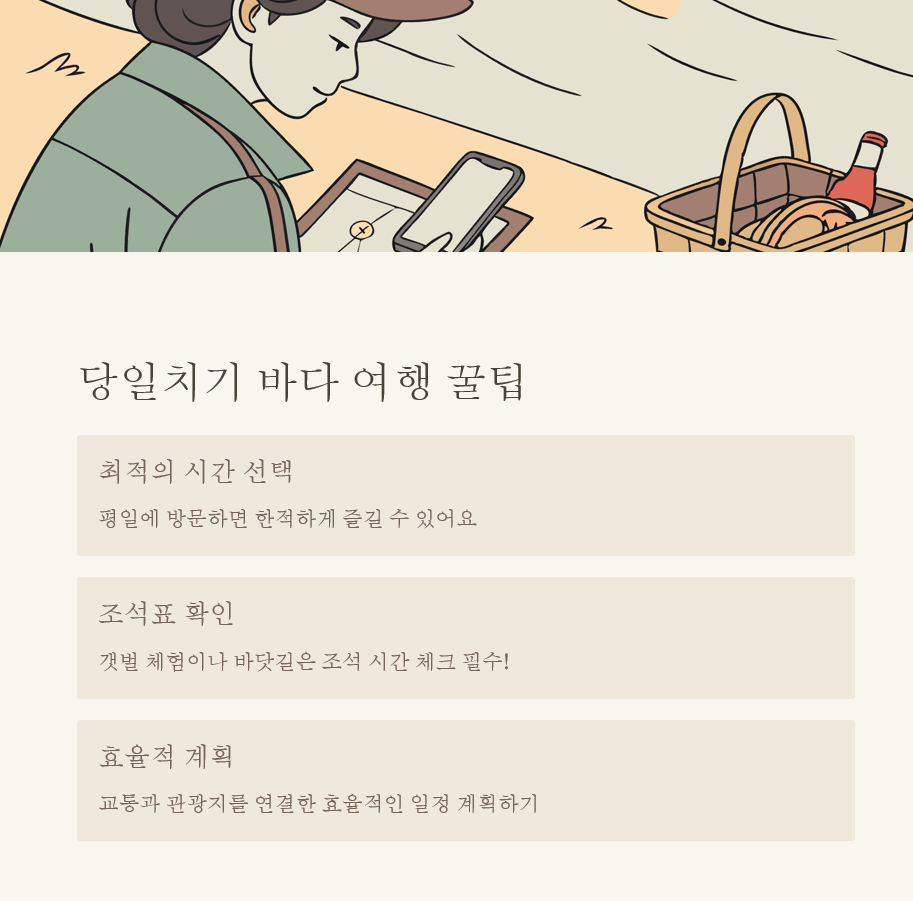 마지막으로, 간단한 피크닉 용품(돗자리, 간식, 물 등)을 준비해가면 바다를 더 여유롭게 즐길 수 있어요[9]. 여름에는 자외선 차단제를, 겨울에는 따뜻한 옷을 잊지 말고 챙기세요!